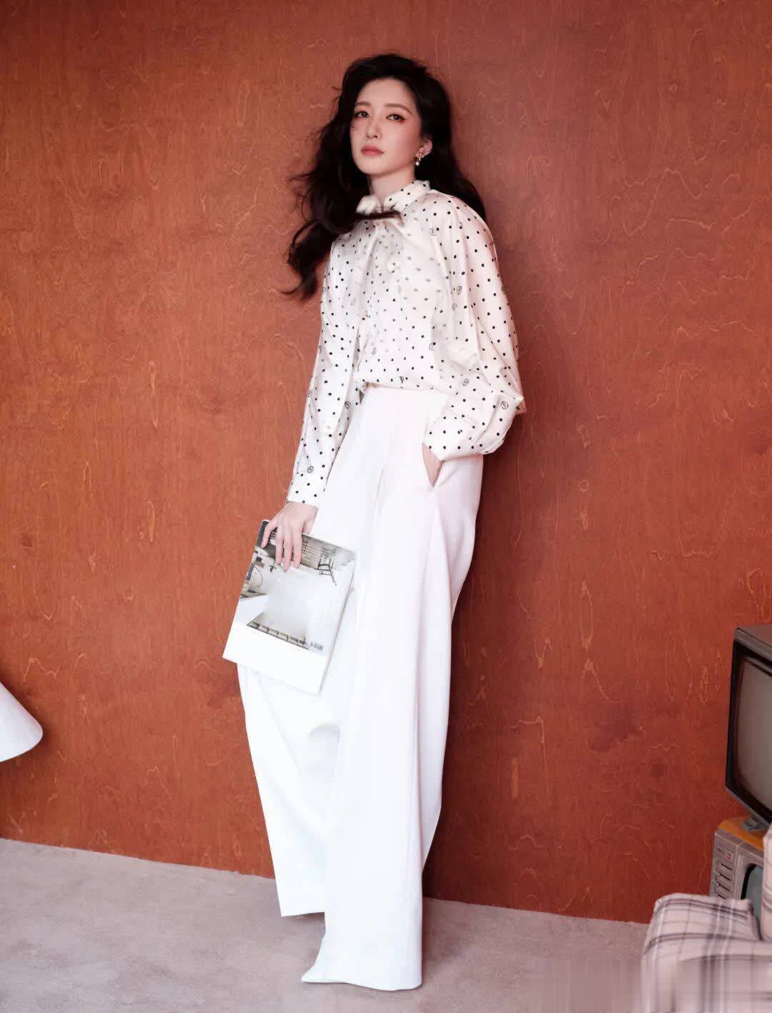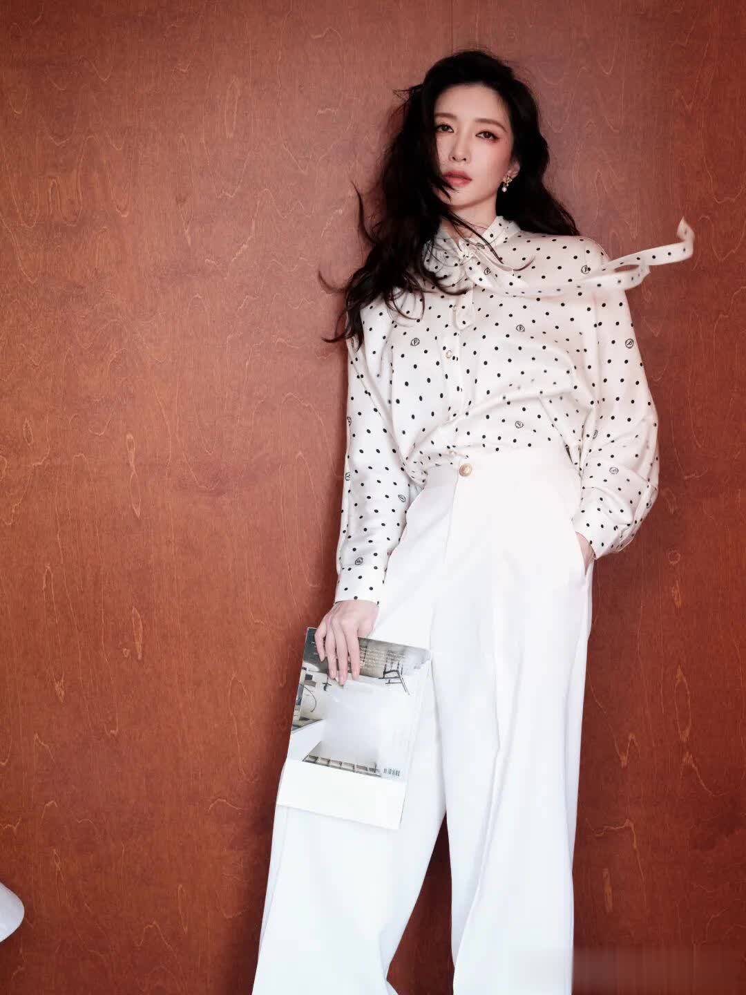 丝滑的缎面波点衬衫搭配垂顺飘逸的白色阔腿裤,冷静的色调传递出高智感美学——理性、沉稳且富有内涵。