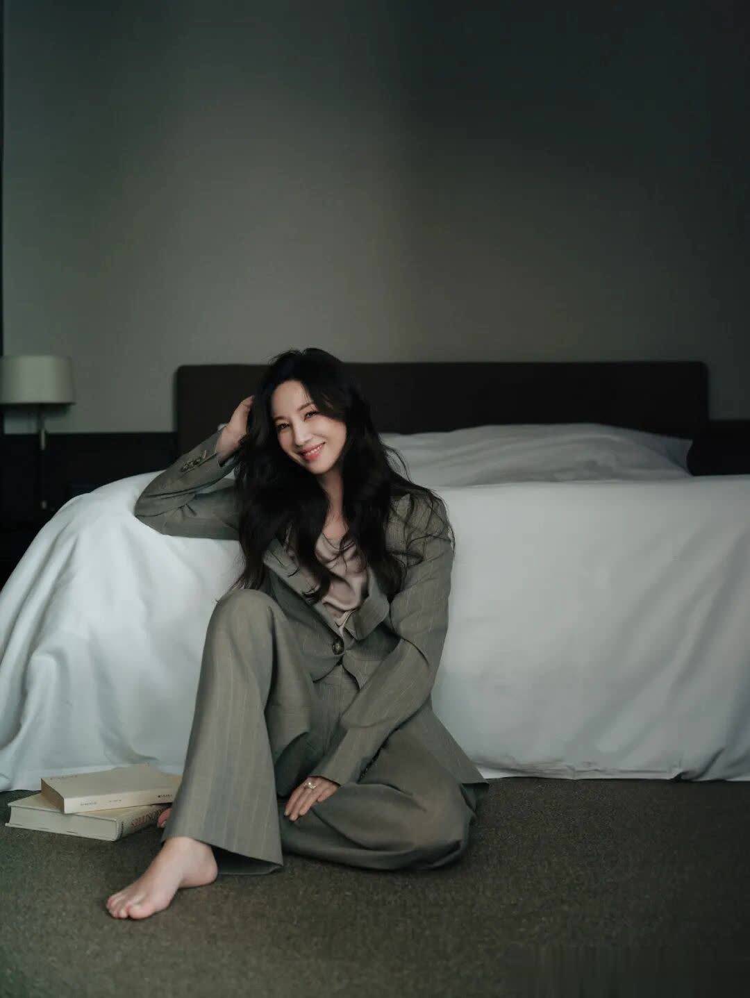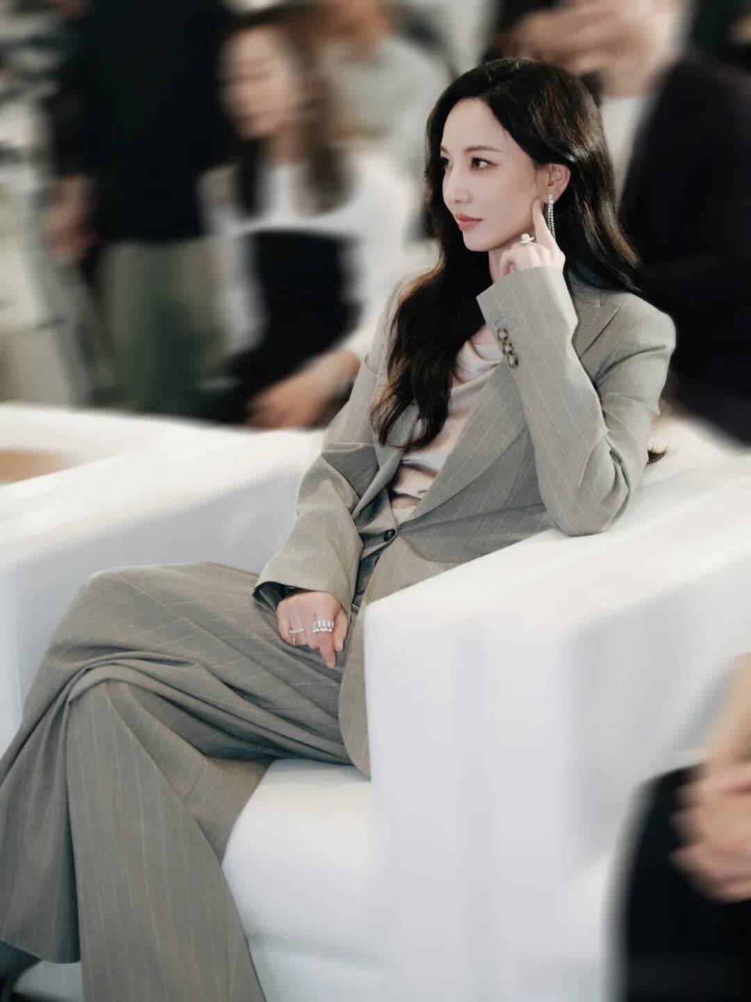 灰色系西服套装的冷色调给人一种淡淡的清冷感,温婉又沉稳,搭配黑色长卷发赋予女性特质。沐浴时光,凝结纯粹之美。